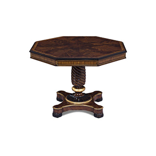 Introducing the stunning Bleached Crotch Mahogany Center Table with Avodire Banding, Antique Gold Leaf and Ebonized Accents I