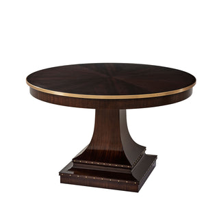 The perfect petit dining room table or essential entryway table- the choice is yours. The round sunburst table top is figured in Mahogany veneer with a reeded edge outlined in Hampton brass. The down-swept monolithic table pedestal is supported by a Cavetto molded base detailed with brass nailheads.