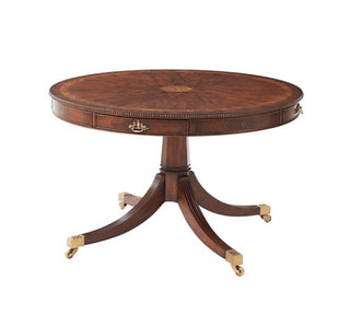 A morado and pollard banded circular dining table, with a carved edge and four frieze drawers with brass handles, the hexagonal column issuing outswept reeded legs on castors. The original Regency.
