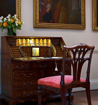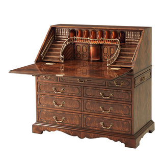 A fine flame veneered bureau, the sloping fall enclosing a fitted interior of faux book and hidden drawers and cabinets, the staircase gallery interior, above a short frieze drawer flanked by dummy drawers, with two short and two long drawers below, on bracket feet; the sides with further drawers and hidden drawers.