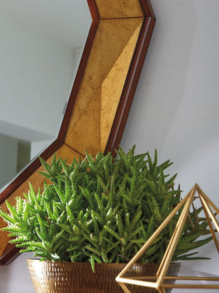 The 10-sided design of the mirror features diamond facets that sparkle in hand-burnished gold leaf.